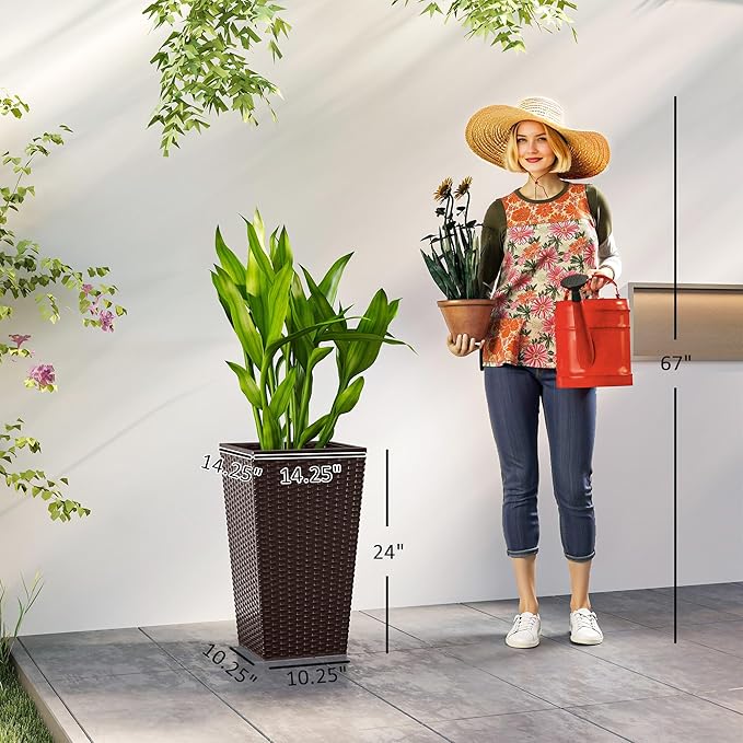 Outsunny Tall Planters for Outdoor Plants Set of 3, 24 in Taper Planters with Drainage Holes, Rattan Decor Plant Pots for Indoor Outdoor Front Porch Patio Backyard, Brown