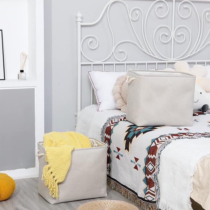 - [Multipurpose Storage] These large linen storage baskets for organizing provide an efficient solution in your home, office or travel to meet many storage needs such as organizing clothes, towels, blankets, toys, baby products, pet products, magazines, newspapers, camping tools, etc. Its storage capacity can keep the family tidy and beautiful, shelf baskets for organizing closet are a wonderful choice