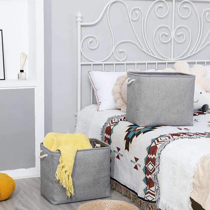 Bidtakay Collapsible Storage Bins for Clothes Large Grey Storage Baskets with Cotton Handles 17x12x15 In Set of 2 Fabric Cubby Storage Bins Livingroom Home Decorative Storage Organizer for Blankets