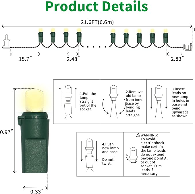 - 5mm LED Christmas Lights: 100 counts warm white 5mm wide angle stable LED string lights spaced 6.3 inches apart with green wire. 7.1 inch leads have a stackable male plug and 5.9 inch tails have a female plug for easy end to end connection.