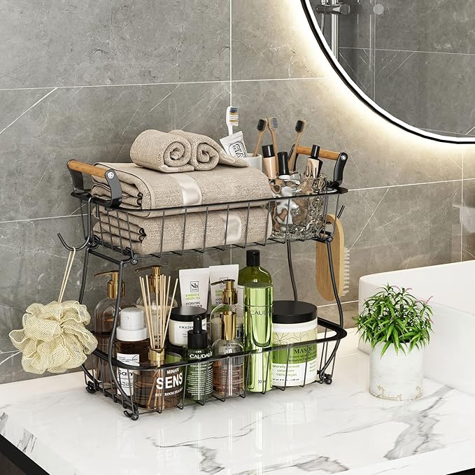 - Sturdy Material and Stable Structure: Made of rustproof wrought iron with a classic black powder coating. Each basket has 4 circular feet that keep the fruits away from dirty desk and provide great balanced support. The portable wooden handles designed for easy carrying.