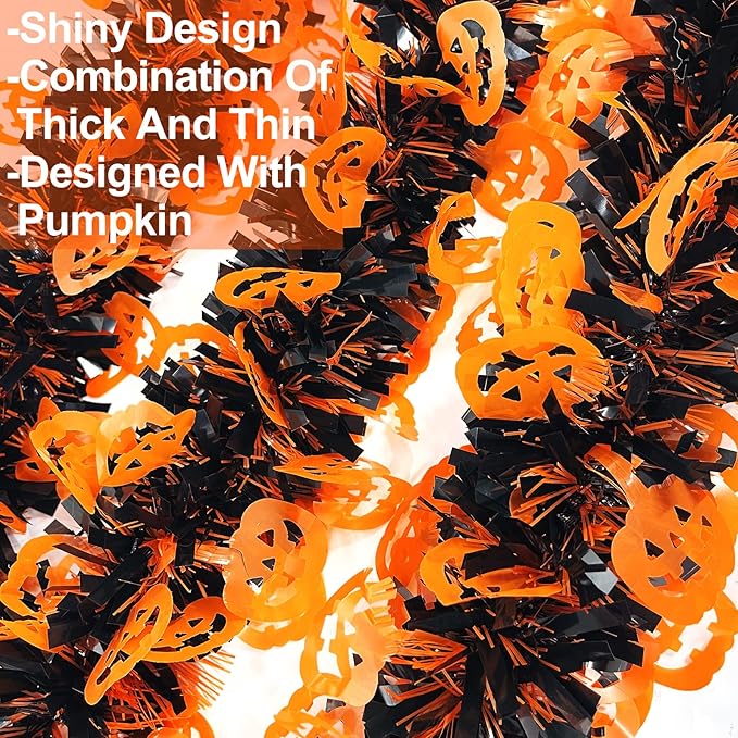 - Halloween Tinsel Garlands: Package includes 2 Pack Halloween tinsel garlands with large Jack-O-Lantern pumpkins shaped cutouts (1.8*1.5 inch). Each is 33 ft in length and 4 inch in width, 2 pack totally 66 feet, enough for your Halloween party decor