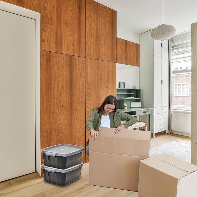Rubbermaid Roughneck Tote 3 Gal, 6 Pack, Made in USA, Black & Gray, Rugged Plastic Stackable Storage Bins with Lids and Handles