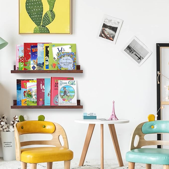 - Wall Mount Floating Picture Shelves:The size of photo ledges is 24in x 4.5in x 1.8in,Wall shelves are made of natural wood which is healthy and tasteless.So they are sturdy enough to hold your favorite collections, family photos (as picture ledge shelf), kids’ books, decorative items, cosmetics or green plants.