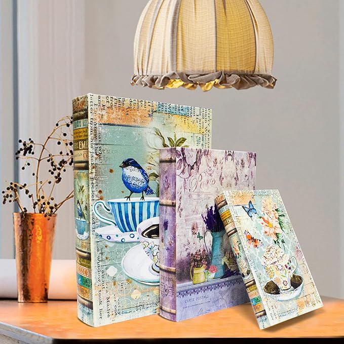 Decorative Book Box Set of 3, Trinket Keepsake Greeting Card Storage Box, Flower Bird Pattern Vintage Coffee Table Decoration, Graduation Gift Idea