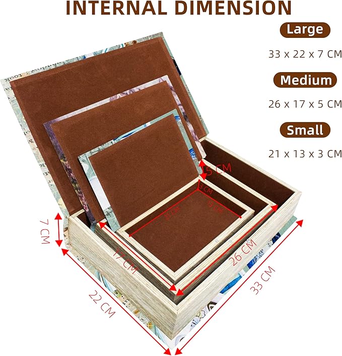 - The inside of this book box has a delicate plush lining and comes in three sizes, ideal for storing items of different sizes, such as jewelry, glasses, Christmas Gift Cards,photos, letters, etc