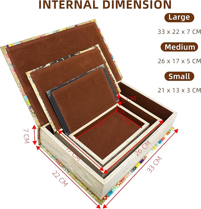 - This set of fake book boxes consists of three large, medium and small boxes. Large Book Box: External Size: 13" × 8.5" × 2.75"/ Internal Size: 11.7" × 7.5" × 2.3" Middle Book Box: External Size: 10.2" × 6.5" × 1.9"/ Internal Size: 8.8" × 5.5" × 1.5" Small book box: Outer size: 8.2" × 5" × 1.1"/ Inner size: 7" × 3.9" × 0.8"