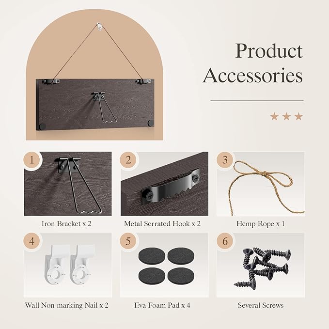 - 👪 Exquisite Home Decoration -- Natural grain wood is suitable for retro style home improvement, country house, lake house, new office, personal studio. Comes with a variety of accessories, as long as it is simple to install, it can be hung on the wall or placed on the desktop.