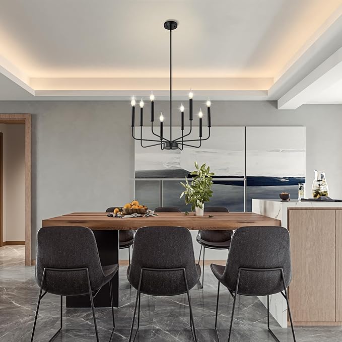 - Modern Fashion Design: A classy candelabra chandelier with different lengths of arms and black matte finish which allows you to clean easily. The appearance of 8 uneven arms look genuine and novel. The whole minimalist design is classic but not rigid. With this simple and retro look can upgrade your space that is elegant but generous