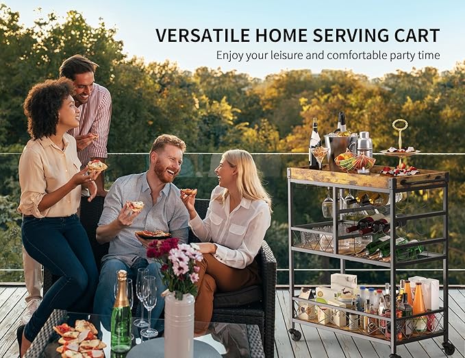 - MULTIFUNCTIONAL BAR CART: The stylish three-layer retro wine cart is suitable for a variety of scenarios in life, a storage rack for food and tableware in the kitchen, a service cart next to the dining table, and a movable dining cart for placing wine and snacks at barbecues or outdoor parties