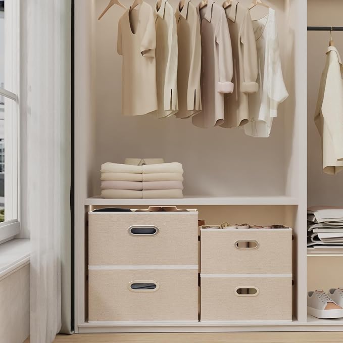 Yawinhe Fabric Storage Bins with Handles, Foldable Baskets for Shelves, Cubes with 3 Handles, Large Boxes for Clothes, Beige, 16.9''Lx11.8''Wx10.2''H, 4-Pack