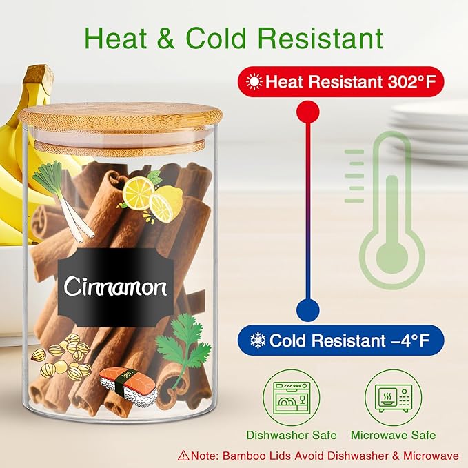 - 【Value Bamboo Food Storage Jars Set】Get 12 durable 20oz glass pantry storage containers with airtight bamboo lids (3.44"×5.36"), 58 pre-printed + 12 blank labels (with marker), and a cleaning brush. Perfect for storing dry goods, crafts, or bathroom essentials.