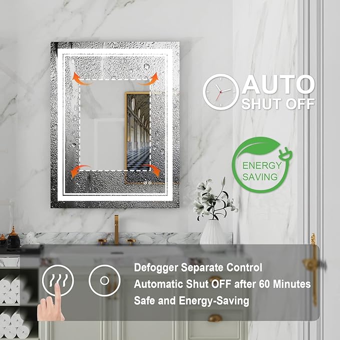 - Defogging: WELLFOR wall mounted mirror one key to open the built-in anti-fog function, which means there's no need to constantly treat your mirrors with a fog-free spray, or rinse them multiple times per shower. Besides, Anti-fog power will be automatic shut off after 60 minutes, safe and energy-saving.