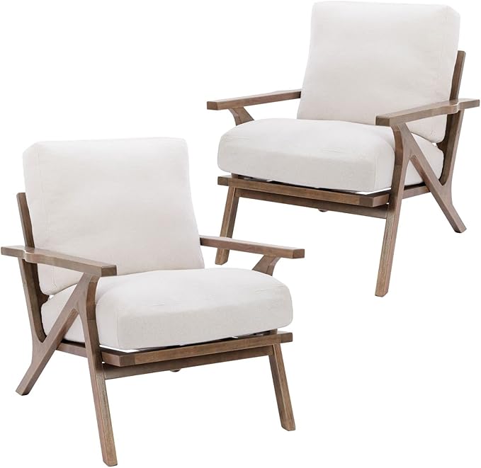HNY Mid Century Modern Accent Chairs Set of 2, Farmhouse Linen Upholstered Armchair for Living Room, Bedroom, 23'' Seat Wide Retro Leisure Reading Chair Slipper Chair with Wood Frame, White