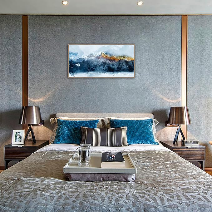 Framed Canvas Wall Art Indigo Abstract Mountain Pictures Wall Decor Blue Grey Orange Mountain Peaks Canvas Painting Prints Modern Abstract Artwork for Living Room Bedroom Decoration 24" x 48"