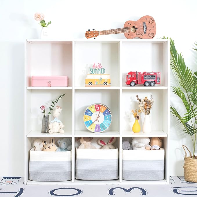 MINTWOOD Design 3-Pack Storage Baskets for Shelves, Playroom and Classroom, Book Basket, Decorative Storage Cube Bins, Woven Closet Organizers, Pantry and Shoe Organizer, 3-Tone Grey
