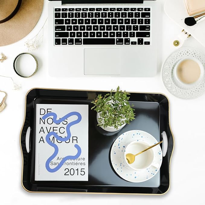 Spsyrine Large Black Serving Tray with Handles, Plastic Decorative Tray for Coffee Table, Ottoman, Bathroom, Home Decor 17.3"*11.8"*2"