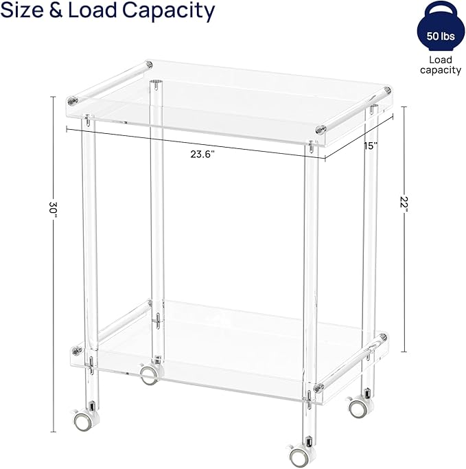 HMYHUM Acrylic Bar Cart, Rolling Serving Cart with 4 Lockable Wheels for The Home Bar, Kitchen, Living Room, Modern, 2-Tier, 23.6" L x 15" W x 30" H, Clear