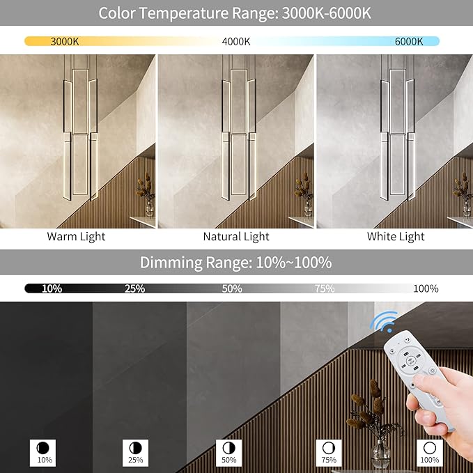 - [ LED Chandelier Applicable scene ]: Rectangular High Ceiling Chandelier Very suitable for modern home design Adjustable Black Chandelier can be DIY to various shapes easily by adjusting the cables Hanging Modern Ceiling Light with remote Suitable for Foyer, Staircase, Hallway, Kitchen Island, Craft Room, Hotel, Villa, Large living room with high ceiling Etc.
