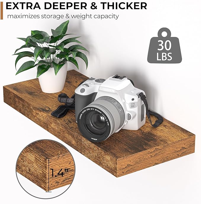 - Extra Deeper & Thicker - Each board measures 16"W x 6.7"D x 1.4"H. Extra deeper and thicker design in order to bring maximizes storage space and weight capacity, even hold up to 30 lb each. This floating shelf taking up zero square feet, reduces clutter and highlights décor in compact spaces.