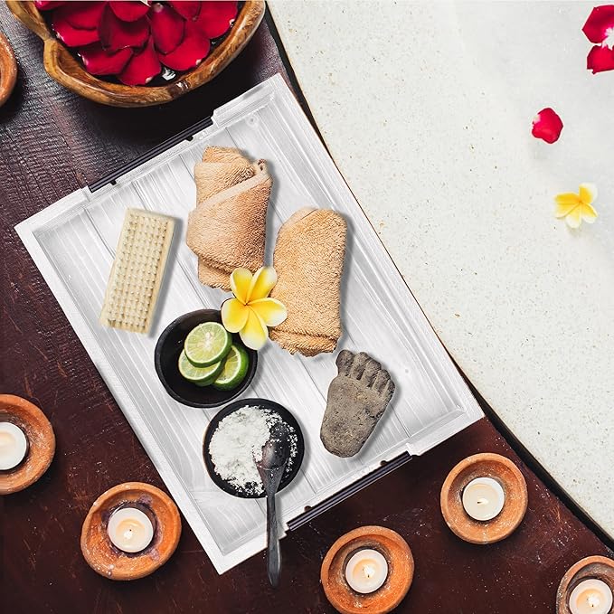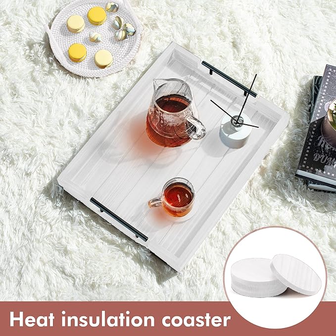 Ottoman Tray | Wooden Serving Tray with Handles & Coasters - 17x13 Inch, Rustic, White, Solid, Rectangular, Vintage, Lightweight