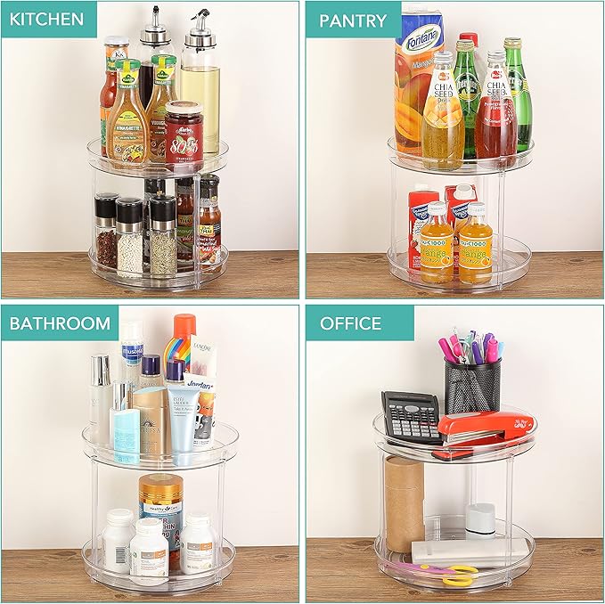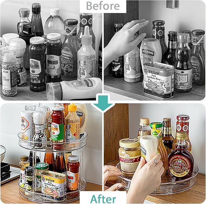 - Maximize Storage Space: This clear bathroom organizer comes with 2 tiers to help you maximize on your limited space. Save your space and store more in limited area. This pantry lazy susan maximizes storage space, especially in corner cabinets and deep base cabinets where items can be hard to reach. Say goodbye to messy kitchens and cabinets, make better use of every space in your home.