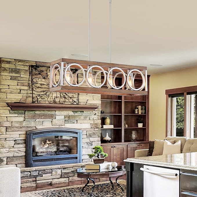 - VINTAGE FARMHOUSE CHANDELIER: The open-cage farmhouse dining room light fixture features a rectangle frame in distressed wood grain finish metal with barn-inspired cricular design stretching across each side, recalling reminiscent of classic, costal and vintage aesthetics. Please note that because the product is painted by hand, Each chandelier is unique in appearance and the uniformity of appearance cannot be strictly consistent.