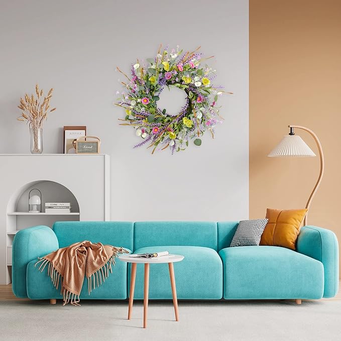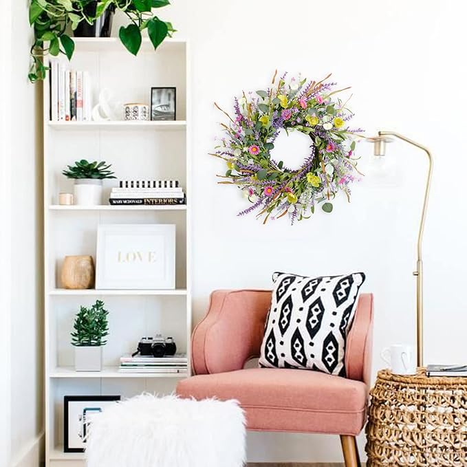 - [Spring Artificial Flower Front Door Wreath] More than three kind of different green leaves match four kinds of different spring fresh and life looking wild flowers. This front door wreath will give your door much more energy and vigor. Good choice for Spring decor.