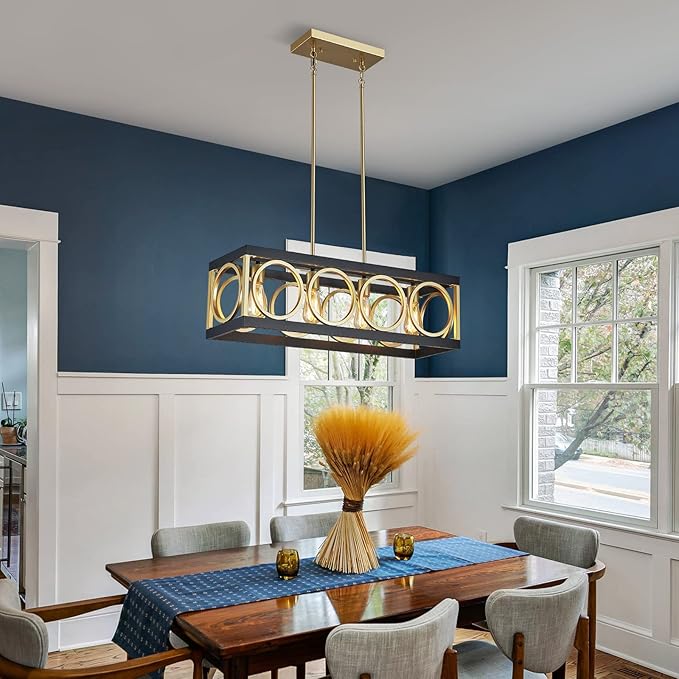 XINGQI Modern Rectangle Chandelier, Farmhouse Kitchen Island Lighting Rustic Industrial Hanging Light Fixture 4-Light Metal Linear Pendant for Dining Room Living Room Hallway, Black and Gold
