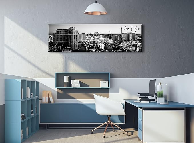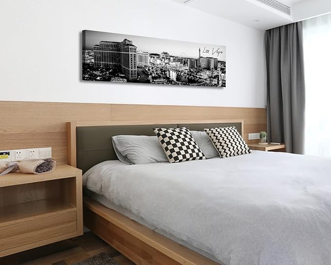 Las Vegas Skyline Wall Art for Living Room American Cityscape Canvas Prints Black and White City Bellagio Fountain Skyscraper Night View Panoramic Pictures Modern Building Poster Framed 13.8"X47.3"