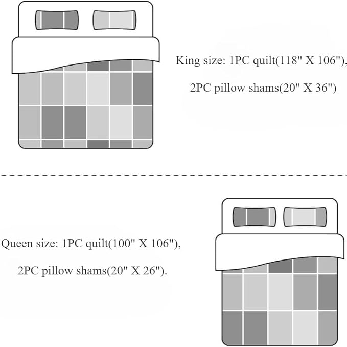 - Package Included Queen: 1PC Quilt(100" X 106") 2PC Pillow Shams(20" X 26") OR King: 1PC Quilt(118" X 106") 2PC Pillow Shams(20" X 36").