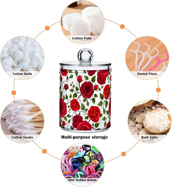 2 Pack Qtip Holder Dispenser Red Rose Flowers Bathroom Storage Canister Lid Acrylic Plastic Apothecary Jar Set Vanity Makeup Organizer for Cotton Swab/Ball/Round Pads, Floss