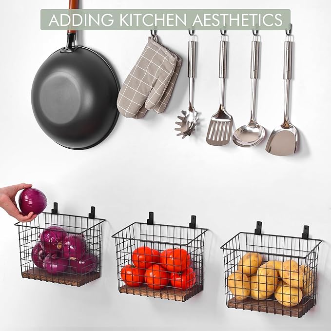 - Large Storage Holders - 9.9" x 5.9" x 7.4" (D x W x H) for each wire basket, with sturdy iron hanging hooks. The shallow-fronted top allows for easier access to items stored inside. Great to keep a wide range of items.