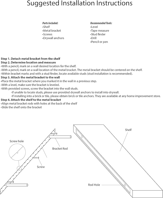 - WHAT YOU WILL GET: Shelf, installation bracket, screws, and anchors. To make the installation process effortless and quick, you will need: Tape measure, Stud finder, Pencil, Level, & Drill.