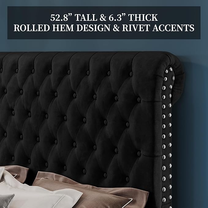 PaPaJet Bed Frame Queen Size Upholstered Platform Bed with 52.8'' Tall Sleigh Headboard, Button Tufted, No Box Spring Needed, Easy Assembly, Black