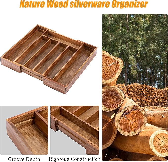 - ✅【Fit your drawer perfectly】Still measuring every kitchen drawer and buying a kitchen drawer organizer of the same size? Our bamboo silverware drawer organizer is designed with 5-7 compartments. Thanks to its adjustable features, our expandable drawer organizer can be expanded from 10 to 15 inch wide, Perfect for any kitchen drawers.