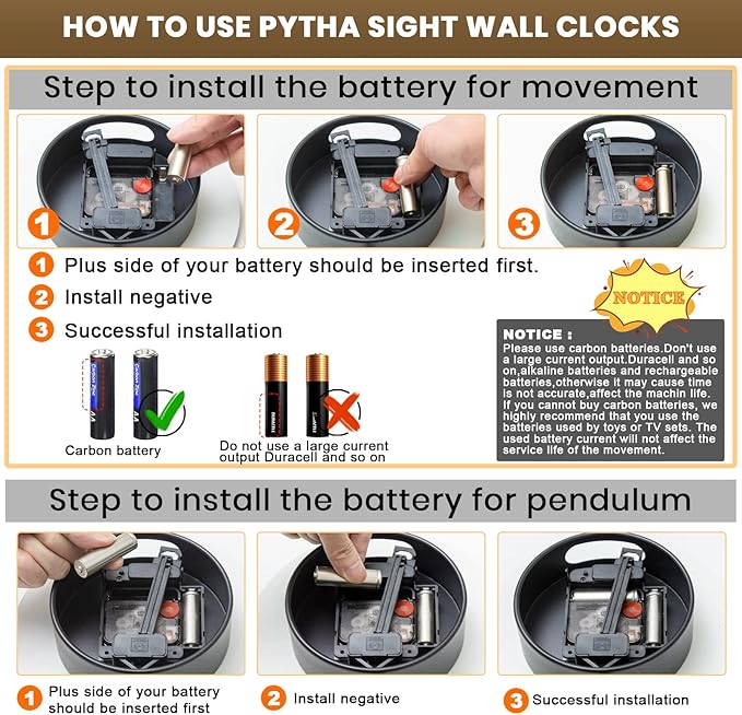 - 【Our Promise Service】Please be sure to watch the installation video after purchase.If your wall clock with pendulum can't swing or hang,please contact us at the first time and we will help you solve the problems! If the black wall clocks don't work,please contact us, we'll offer you after-sale service and our team will give you satisfactory after-sales service within 24 hours.