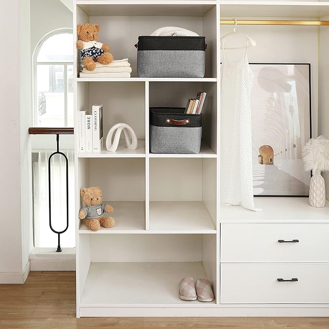 - Decorative Fabric and Vegan Leather – These versatile storage baskets for organizing your everyday life are made with a thick, high-quality fabric and fitted with leather handles to add a stylish touch to a living room, bedroom, office, or personal space.