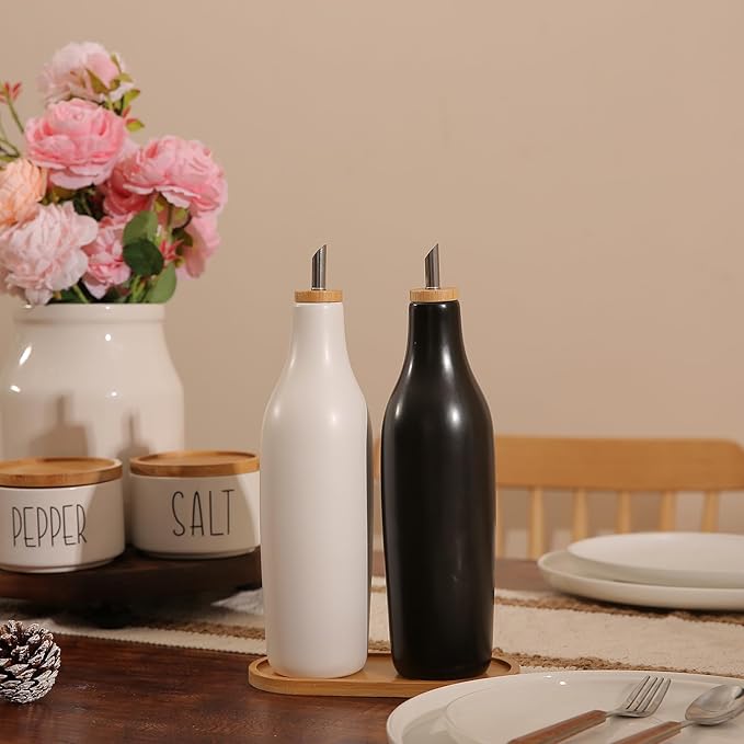- Ceramic Oil Dispenser Bottles: Set of 2 16.9oz oil bottles made from ceramic material for easy cleaning and dishwasher safe.