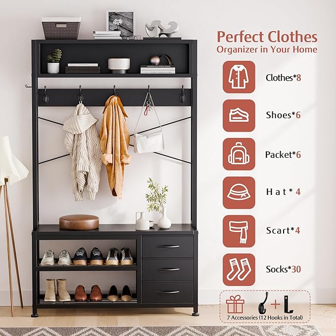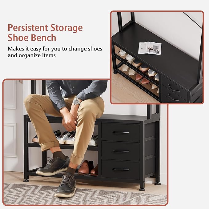 Lulive Hall Tree with Bench and Shoe Storage, 31.5" Coat Rack Freestanding with 2-Tier Storage Shelf, 6-in-1 Entryway Bench Coat Rack with 12 Hooks and 3 Drawers(Black)