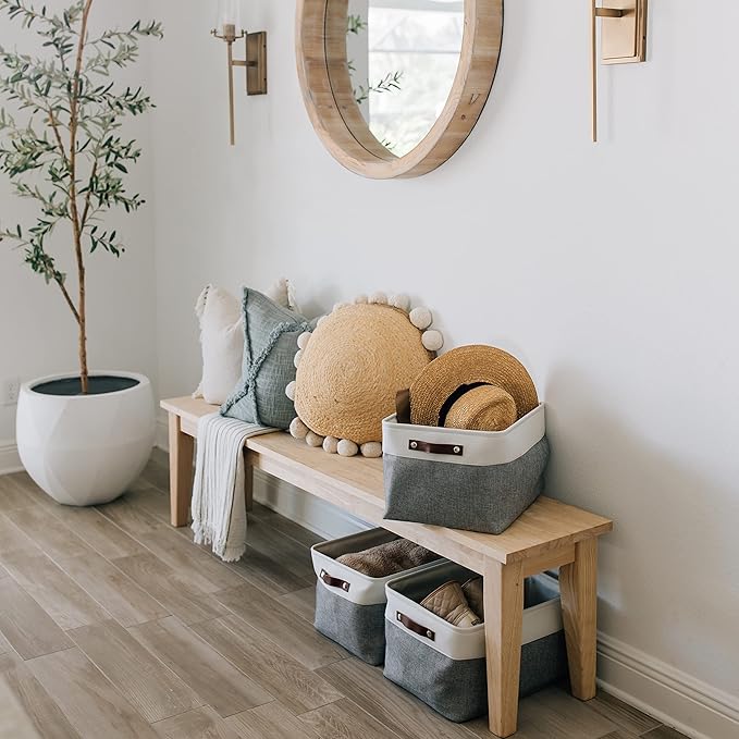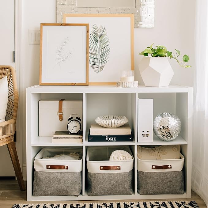 - Decorative Fabric and Vegan Leather – These versatile storage baskets for organizing your everyday life are made with a thick, high-quality fabric and fitted with leather handles to add a stylish touch to a living room, bedroom, office, or personal space.