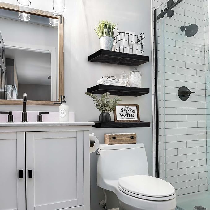 QEEIG Floating Shelves for Wall Bathroom Shelf Bedroom Kitchen Living Room Hanging Book Shelves Small Farmhouse Decor 16 inch Set of 3, Black (015-B3)