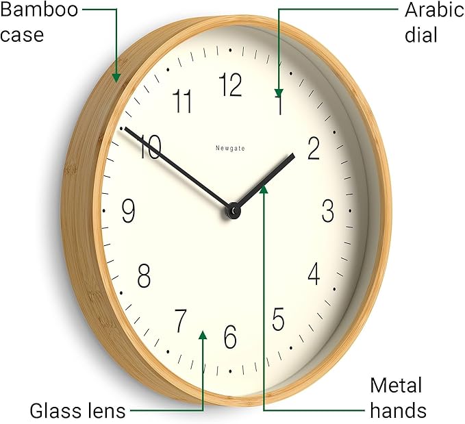 - Round wall clock with a natural bamboo case and a clean, uncluttered dial for a fresh, modern look.