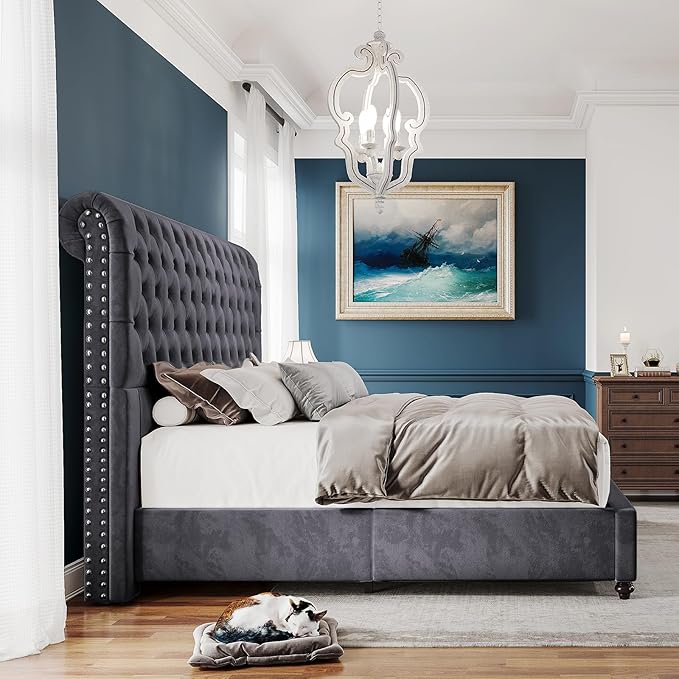 - Elegant Velvet Upholstery with soft velvet covering headboard for comfort & warmth, creating fantastic sense of atmosphere