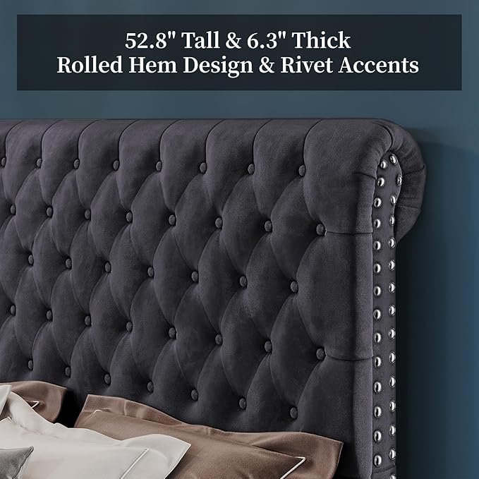 - Rolled-edge Tufted Headboard with 52.8 inch high headboard featuring rolled edge design, studded trim, deep tufted buttons to provide comfortable back support