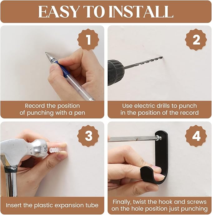 - 【Easy To Install】 - Equipped with 6 strong hooks, including 3 Pcs traceless transparent hooks(bear up to 11 LB), and 3 Pcs Black space aluminum hooks, which are needed to drill holes for installation. But it is easy to assemble(The Steps show as the picture). Warm Tips: If you don't want to drill or your product weight is less than 11 LB, you can transparent hooks directly. Save your time!