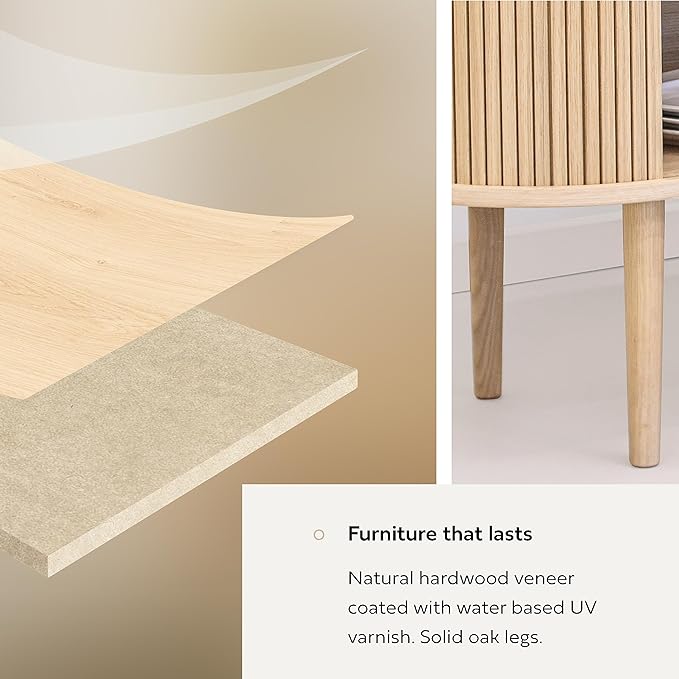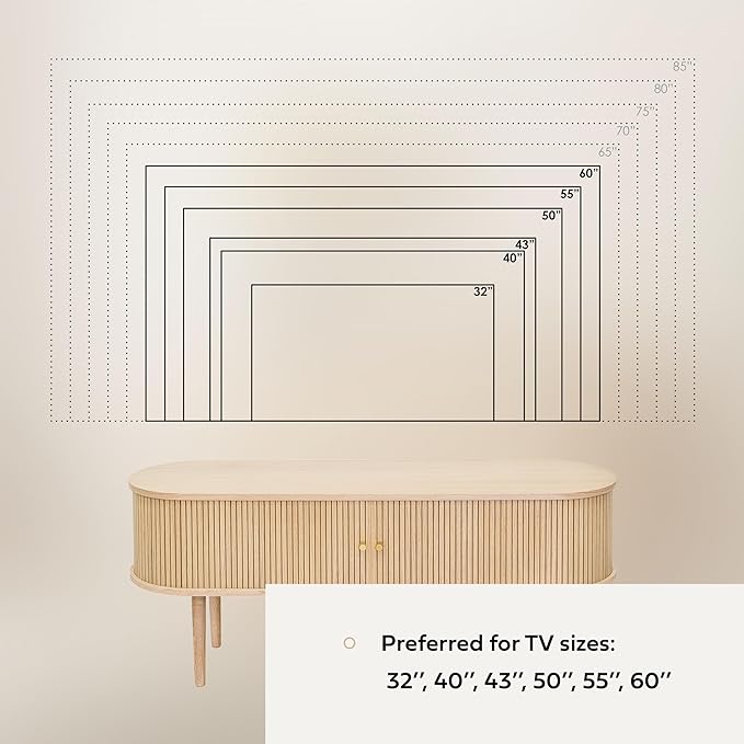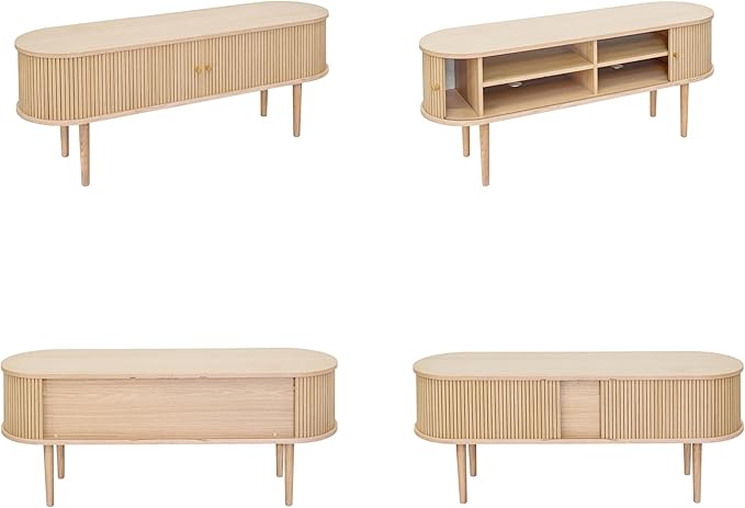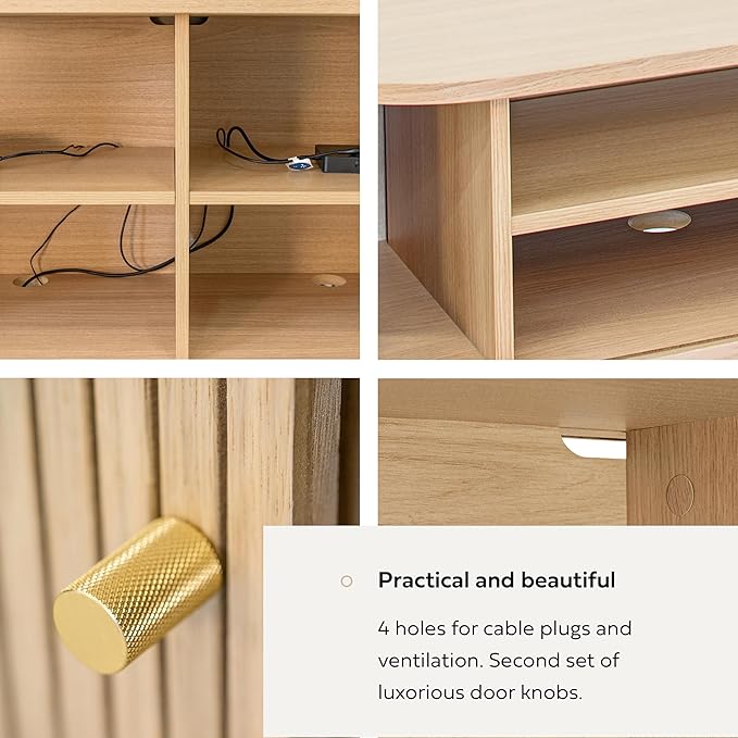 - BRING CHARACTER TO YOUR HOME by using an oak modern tv stand which curvy corners and smoothly sliding tambour doors makes it a perfect accent cabinet. Aesthetic appeal makes it suitable for both living room tv stand and bedroom tv table. You will receive 2 sets of door knobs - wood & messing.