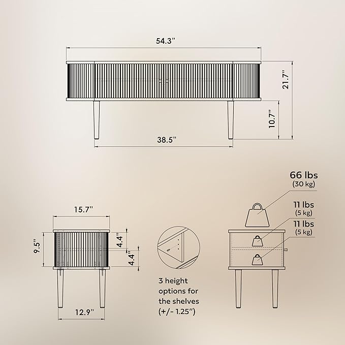 - ENJOY EFFORTLESS STORAGE as you can choose between 3 set heights for the adjustable shelf to maximize the use of the six storage spaces hidden behind the sliding doors. The TV stand cabinet (width 54.3 ‘’ x height 21,7’’ x depth 15.7’’) offers easy access to most frequently used cables, remotes, DVDs, video games and other accessories.