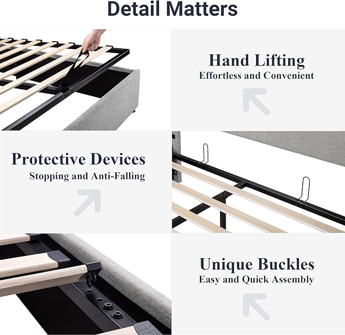 - Space-Saving Storage: With its lifting up storage feature, this bed frame provides ample space to store extra bedding, clothing, shoes, and other items, especially helpful for smaller bedrooms or apartments where storage space is limited