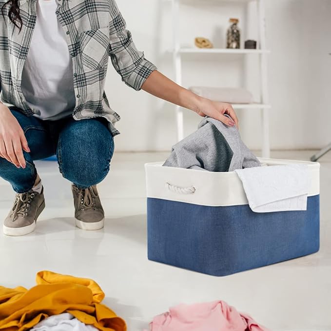Organization and Storage Bins for Shelves - 2 Pack 17X15X12 inch Canvas Storage Cubes Collapsible Baskets for Organizing with Handles, Storage Box for Cloth Decorative (White & Blue)